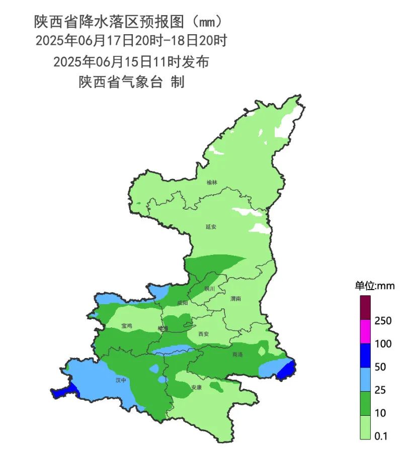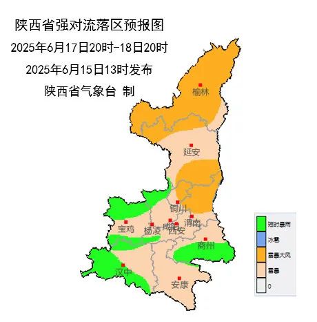 6月18日:全省多云转阴天,陕北有小雨或阵雨(0.1-10mm),关中、陕南有小到中雨(5-20mm),关中西北部、关中南部局地(周至县、鄠邑区、长安区)、陕南西部及东部有大雨(25-45mm),汉中西部局地(略阳县、宁强县)、商洛东部局地(丹凤县、商南县)有暴雨(50-70mm),降水期间部分地方伴有短时暴雨(雨强20~30mm/小时,个别点可达40mm/小时以上)、雷暴大风或冰雹等强对流天气。陕北北部有4级(5.5-8.0m/s)左右偏南风。