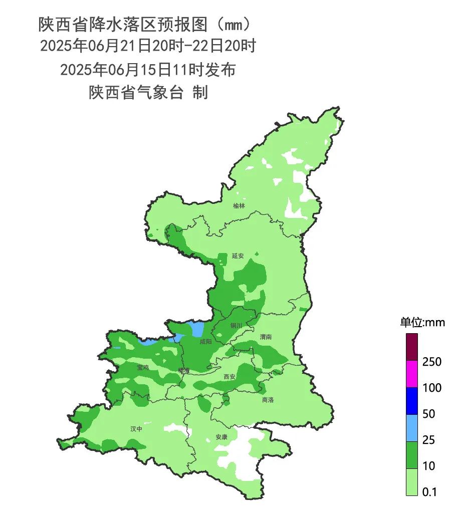 6月21日:陕北多云,关中、陕南多云间阴天,陕北南部、关中大部、陕南大部分地方有分散性小雨或阵雨(1-15mm)。